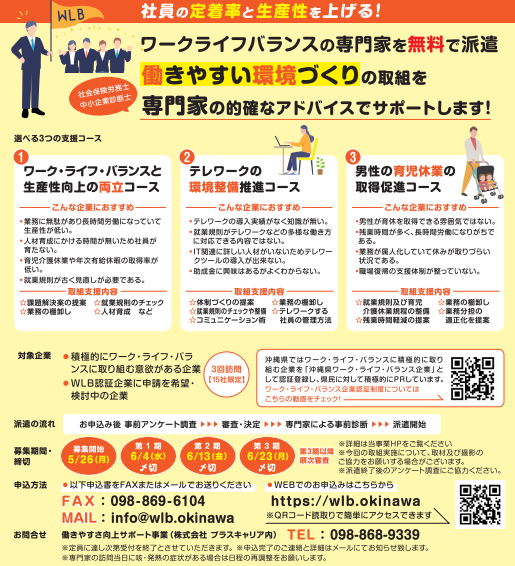 沖縄県では、社員の定着率と生産性を上げるために、働きやすい環境づくりに取り組む事業主に対して専門家を派遣します。男性の育休取得や介護休業などの取り組みにお困りの事業主の皆さまは、この機会をご活用ください。最大3回の専門家派遣(社会保険労務士等)を無料で活用できます。