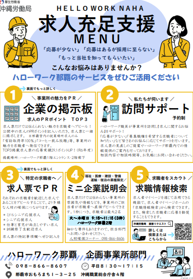 ハローワーク那覇では、応募が少ない、採用につながらないといった企業の求人課題に対して、直接支援・アドバイス・PR機会の提供を行う支援(無料)を実施しています。ハローワーク那覇の月間有効求職者数は 約 14,800人〜15,800人(年度平均)の規模です。支援メニューを上手に活用すれば、希望の人材を採用できる可能性が高まります。お気軽に窓口へお問い合わせください。