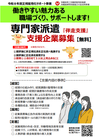 沖縄県正規雇用化サポート事業では、既存従業員の正規雇用化や正社員雇用を検討している企業に対し、中小企業診断士や社会保険労務士等の専門家を派遣し、経営課題克服、経営力向上、人材育成等に関するアドバイスを行います。