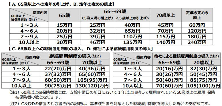 定年引上げ等の措置の内容や年齢の引き上げ幅等に応じて、下表の金額を支給します。
